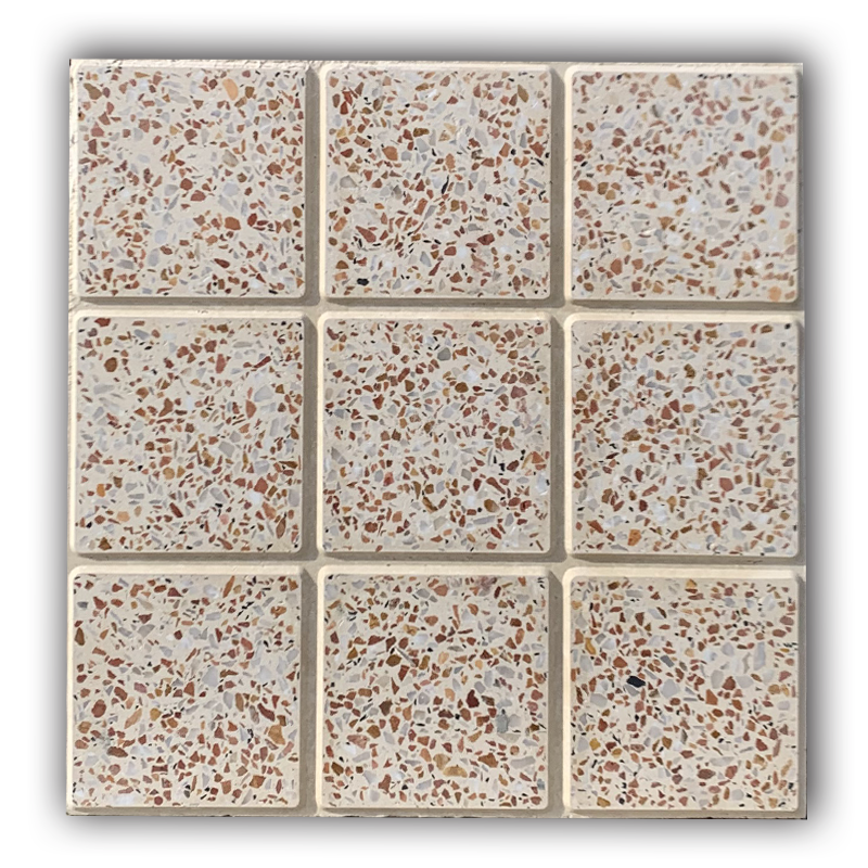 مواد اولیه شامل سیمان، شن، پودر سنگ و رنگدانه ها با نسبت های دقیق و از پیش تعیین شده در میکسرهای صنعتی مخلوط می شوند. برای موزاییک های ونیزی، این مرحله برای لایه رویه و لایه زیرین (که معمولاً از مواد ارزان تر است) به طور جداگانه انجام می شود.